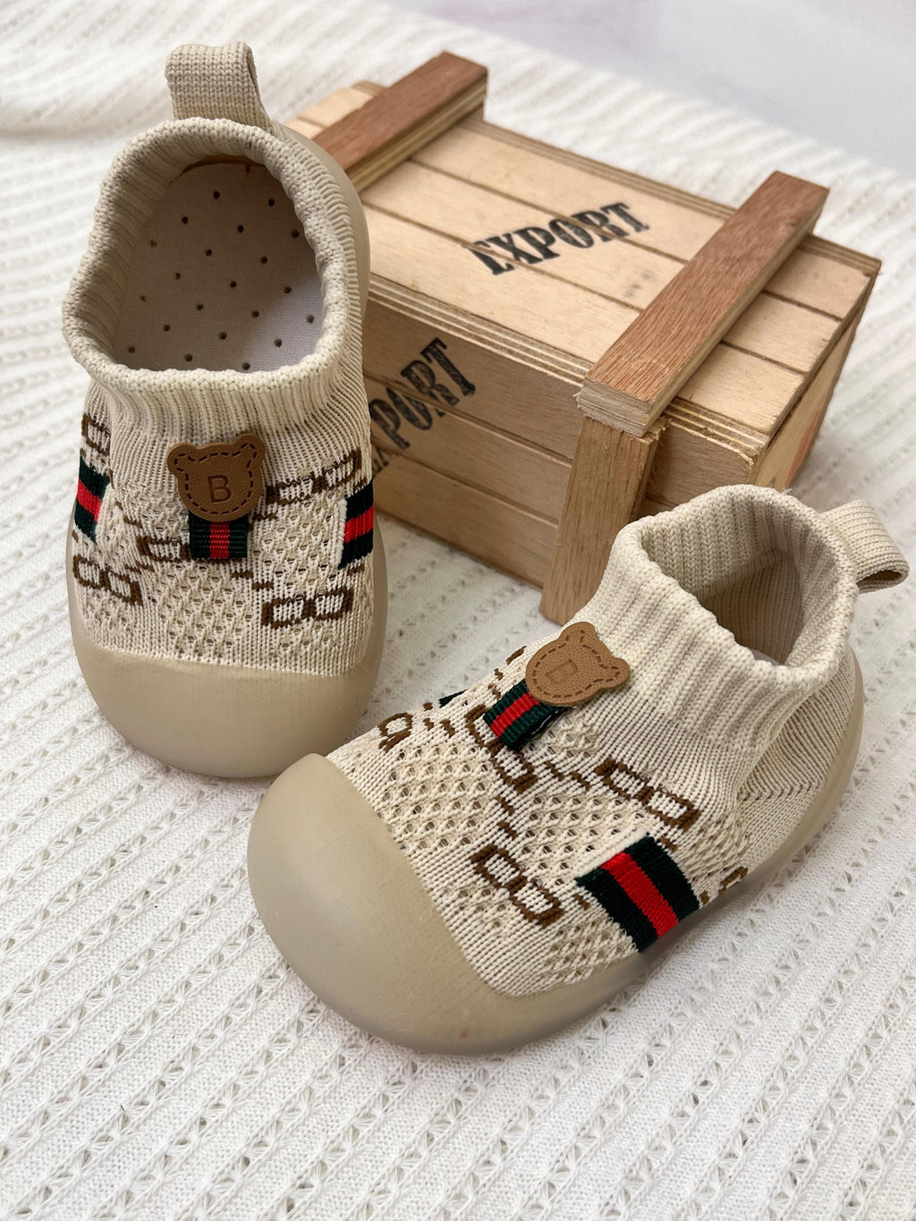 Dale a tu bebé el máximo confort y estilo con nuestras medias zapato en goma estilo Gucci. Diseñadas para ofrecer la protección de un zapato y la comodidad de una media, estas medias zapato son perfectas para los primeros pasos de tu pequeño. Diseño Elegante y Moderno:Estilo Gucci: Inspiradas en el icónico diseño de Gucci, estas medias zapato son un complemento de moda ideal para cualquier atuendo.Colores Sofisticados: Disponibles en una variedad de colores clásicos y elegantes.